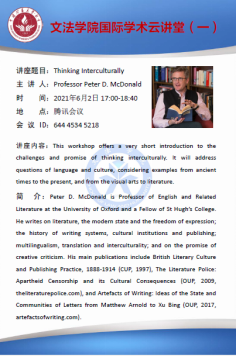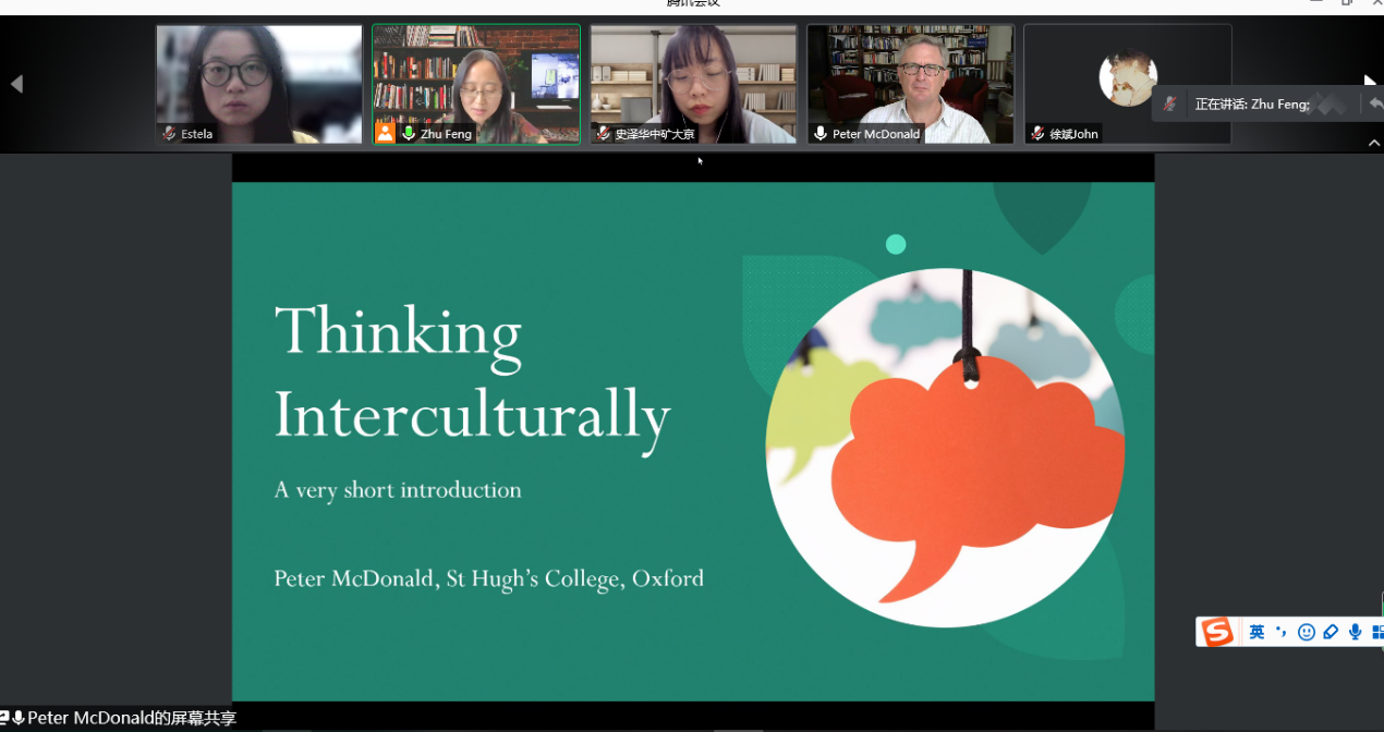 应开云(中国)外语系朱峰教授邀请,牛津大学Peter D. McDonald教授于2021年6月2日为外语系研究生举办了题为Thinking Inter-culturally的讲座。此讲座为英语专业研究生国际前沿课程系列讲座之一,讲座通过腾讯会议平台进行,由朱峰老师主持。英语专业研究生、本科生,非英语专业研究生、本科生,以及外语系部分老师参加了讲座。