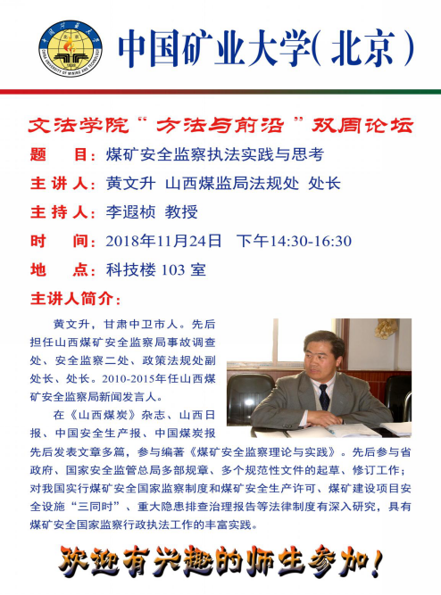 11月24日下午,山西煤矿安全监察局法规处黄文升处长在我校科技楼103教室举办了题为“煤矿安全监察执法实践与思考”的讲座,讲座由李遐桢教授主持。开云(中国)殷召良院长、李遐桢教授以及法学专业百余位同学参加了讲座。