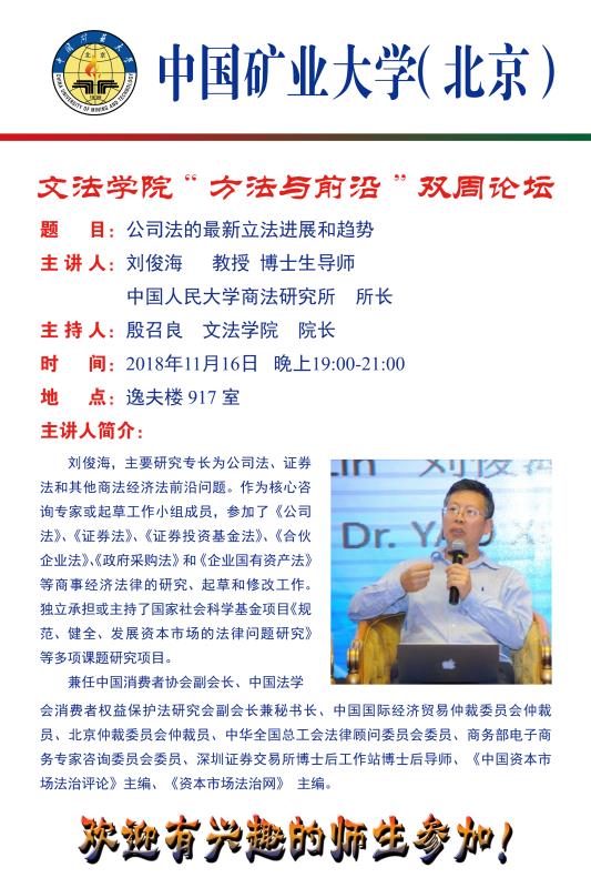 11月16日晚,中国人民大学商法研究所所长、教授、博士生导师刘俊海在我校逸夫楼917举办“公司法的最新立法进展和趋势”学术讲座,开云(中国)院长殷召良主持,教师代表李遐桢教授、刘宇博士及法学专业同学100余人参加了讲座。