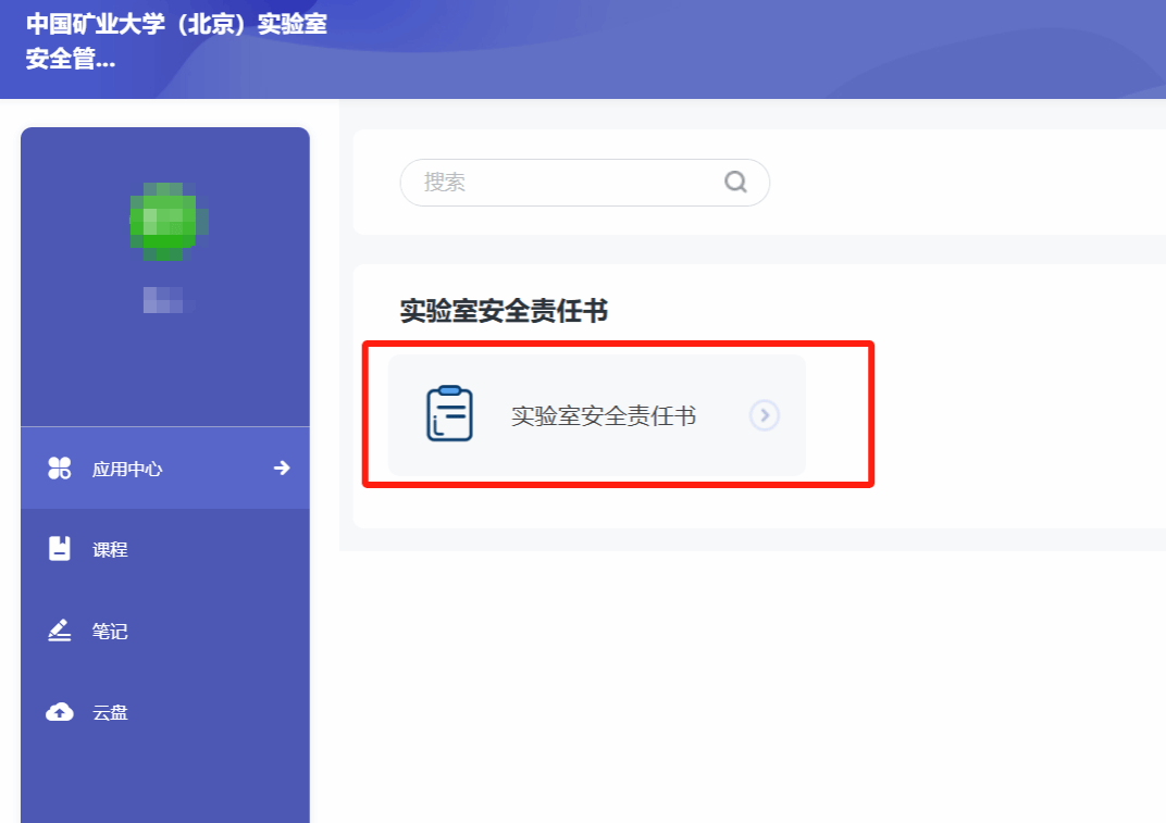 点击学习通首页,切换到:“中国矿业大学(北京)实验室安全管理平台(学生)”界面,点击“实验室安全责任书”填写相关内容,点击提交。
