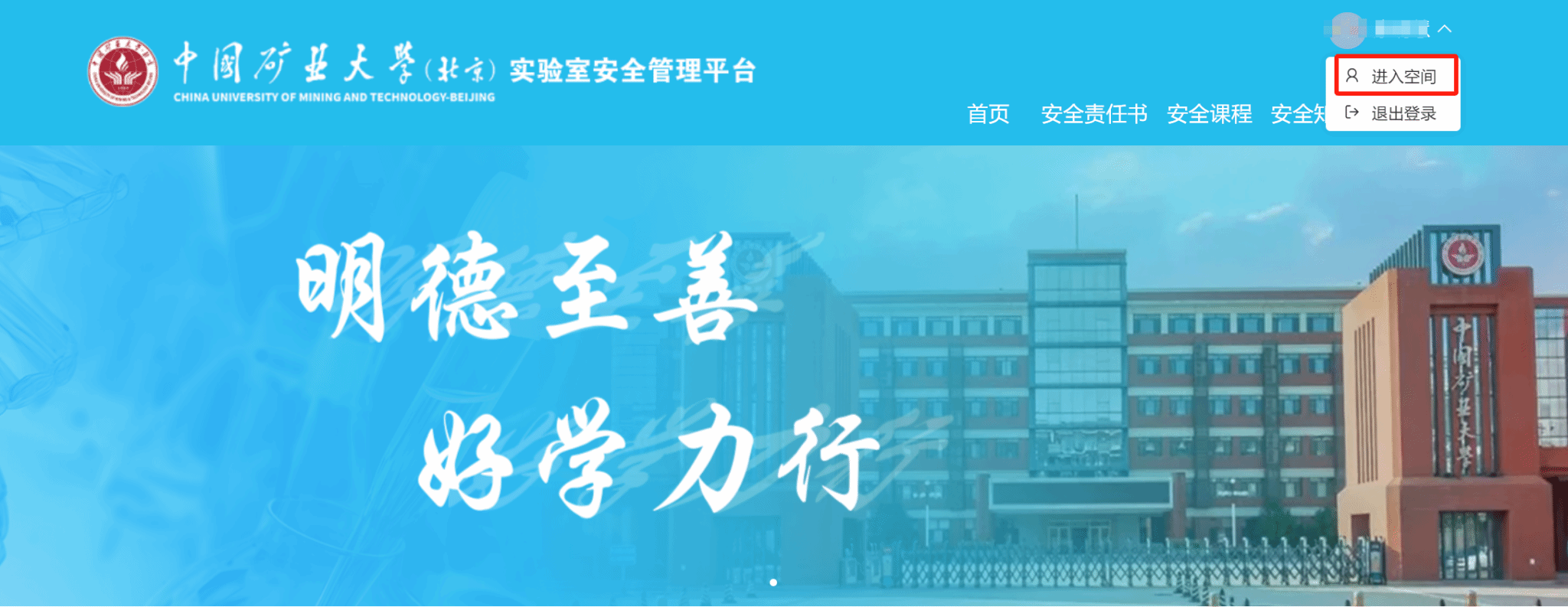 打开中国矿业大学(北京)实验室安全准入平台(https://cumtblas.mh.chaoxing.com),在首页选择“登录”进入用户界面。