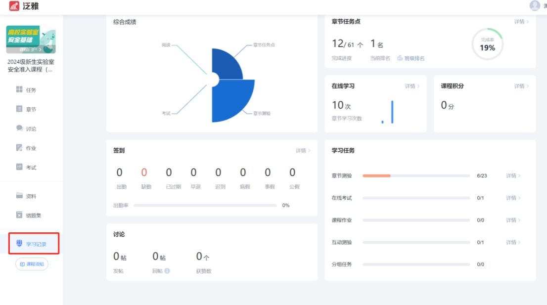 2.进入课程后,左侧为学习导航,可即时收到老师发布的学习任务、考试、查看自己的学习记录。任务点为必须完成的学习内容!