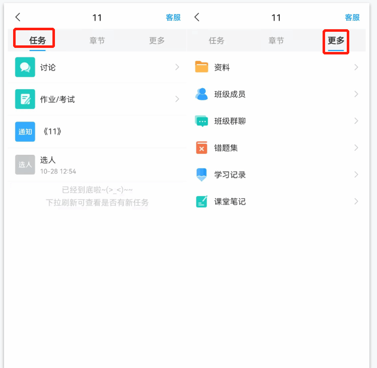 2.点击【任务】,可查看老师发放的各种互动学习任务及各类通知,点击作业/考试可以查看老师发布的考试。点击“更多”可查看老师准备的学习资料和这门课程的个人错题集,班级成员,班级群聊,个人学习记录等。