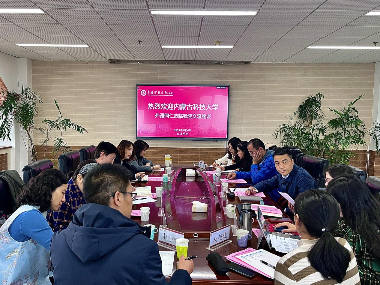 2024年3月26日下午,内蒙古科技大学外国语学院院长耿伟教授一行到我院开展调研。院长刘金程、副院长贾培培组织部分教师与来访专家学者进行了充分的交流。双方就公共英语教学、英语专业本科及研究生教学等议题展开了广泛而深入的研讨。