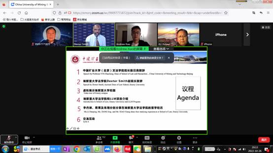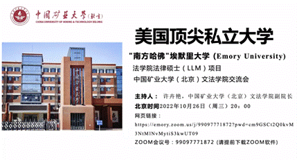 2022年10月26日晚8点,我院与美国埃默里大学(Emory University)法学院成功举行法律硕士(LLM)项目线上交流会。埃默里大学法学院副院长Dexter Smith教授、中国矿业大学(北京)开云(中国)院长殷召良、副院长许卉艳、法学系主任李遐桢、法学系副主任卜素等人参加本次交流会,线上参会师生百余人。交流会由许卉艳副院长主持。