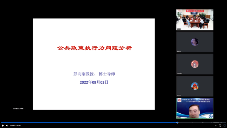 2022年9月3日下午,中国矿业大学(北京)MPA名家讲堂第1期在线上成功举办,本期讲座暨2022级MPA迎新系列学术活动,对外经济贸易大学教授、博士生导师彭向刚教授受邀为我中心师生做了主题为《公共政策执行力问题分析》的讲座。讲座由MPA中心主任杨璐璐主持,200多名MPA师生在线参与了此次讲座。