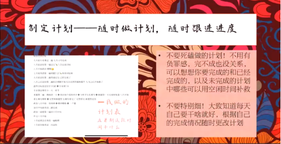 会上,2018级考研上岸的同学对如何精准择校择专业以及如何进行合理的时间规划给出了自己的建议,用自己的亲身经历为大家介绍考研期间的学习方法、时间安排和心态调整策略,讲述了考研备考过程中需要注意的事项和规避的雷区。之后根据同学们的提问,就考研期间需要克服的障碍、初试复试需要注意的事项等作了详细而全面的回答。