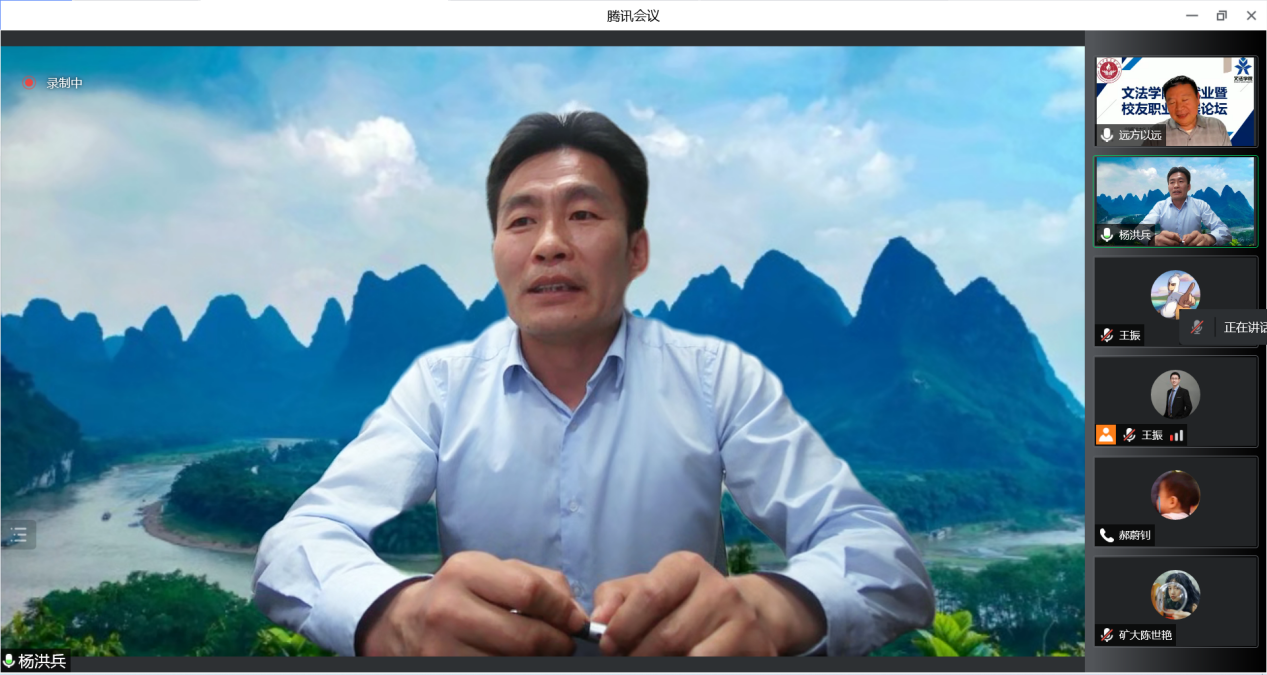 杨洪兵做总结发言。他对丁亚亚校友和郝蔚钊校友的无私分享表示衷心的感谢。学院将继续加强与校友们联系,希望校友们能够多多回母校交流,分享求学、求职、创业经验,开阔学弟学妹们的眼界。同时,希望同学们能及早定向定位,找准自己的方向,积极行动起来,多做准备,创造属于自己的精彩。