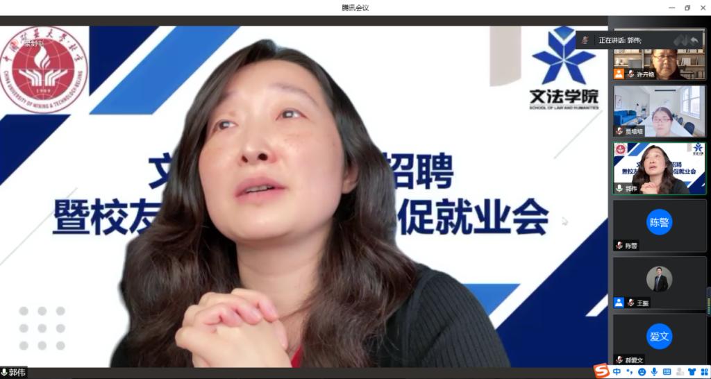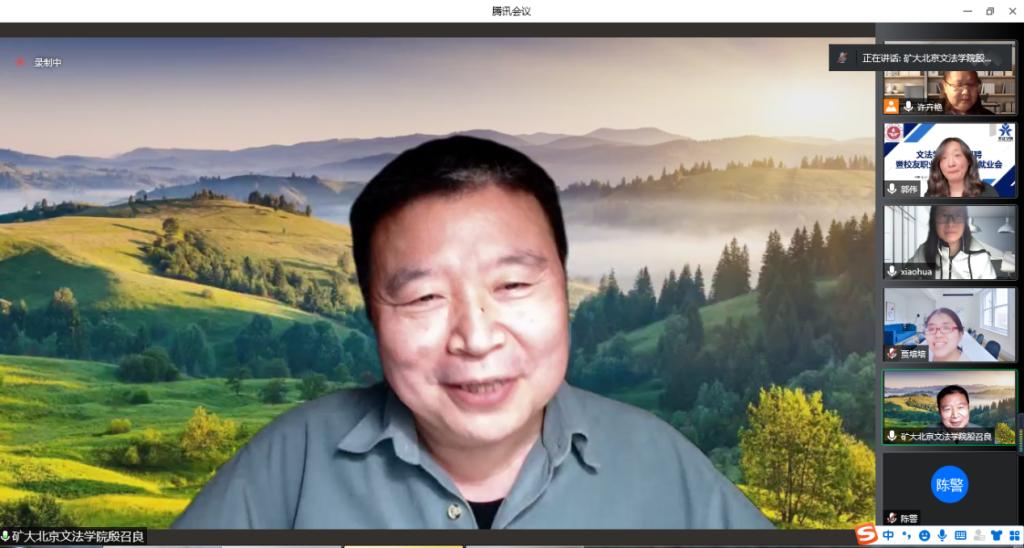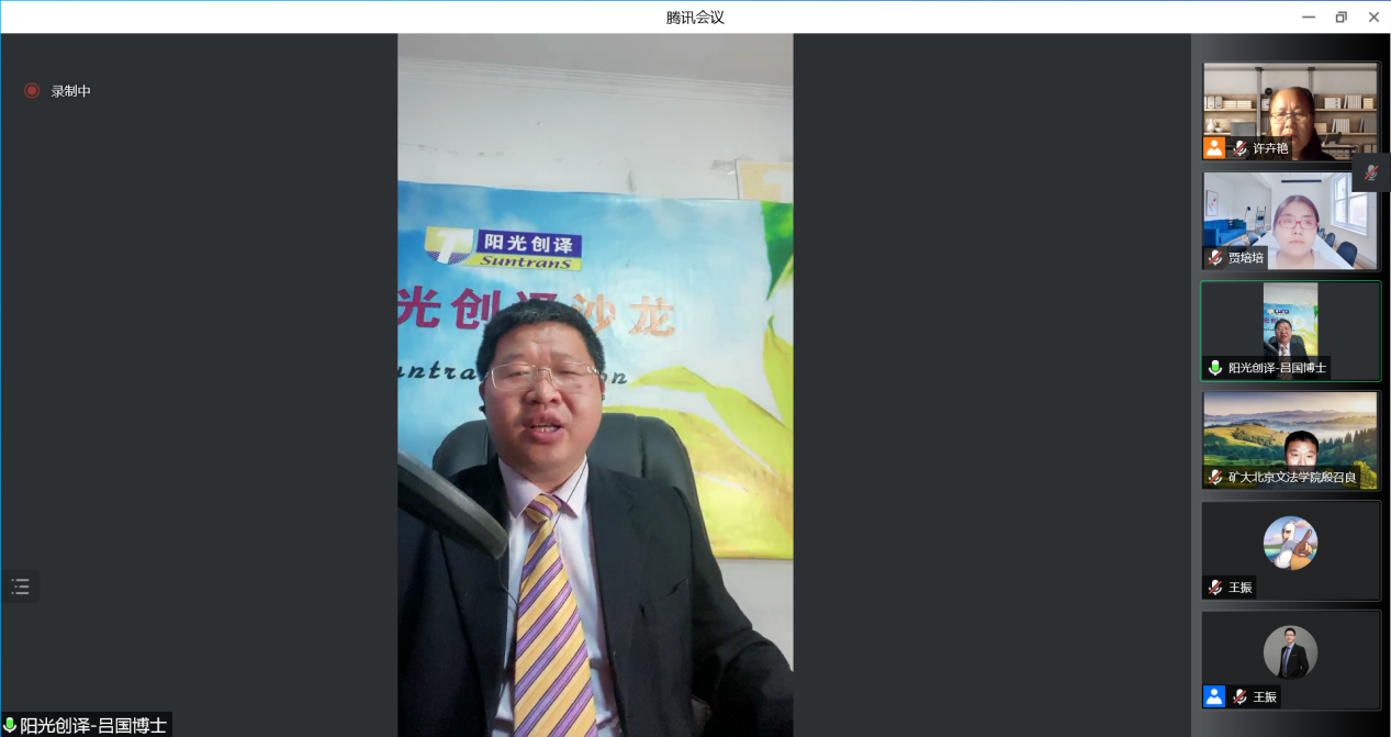 吕国阐述了新冠疫情下就业市场中的机遇和挑战,并结合自己的创业历程、求学求职经历,对择业问题进行了深入解读。同时他介绍了北京阳光创译语言翻译有限公司的发展历程、企业文化及招聘需求,表达了与学校、学院深入合作,招纳矿大高水平复合型人才的真诚意愿。