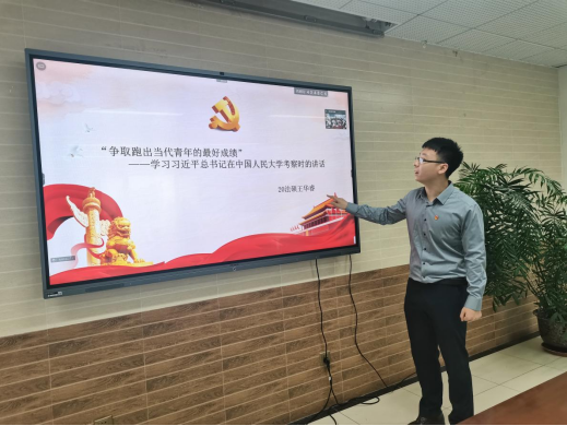 王华睿领学习总书记视察中国人民大学重要讲话,观看习近平总书记视察人民大学的新闻报道,对总书记视察时的重要讲话进行了研读,将总书记历年五四期间视察高校时的讲话进行了展示,并结合自身专业和经历谈心得、谈感悟。