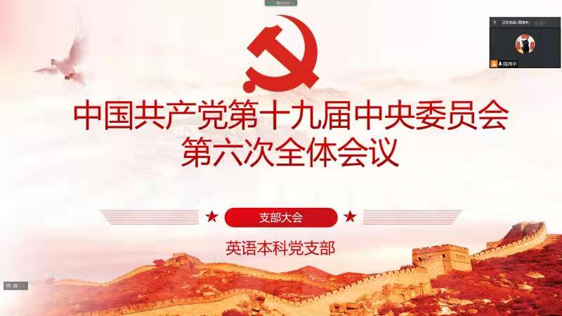 英语本科党支部吴宣妮:过去一百年,党向人民、向历史交出了一份优异的答卷。现在,党团结带领中国人民又踏上了实现第二个百年奋斗目标新的赶考之路。本次学习十九届六中全会精神,我深刻认识到作为学生党员干部,肩上承担的是怎样一份重任。此次学习更是提醒我自己,要不断提升自我,不骄不躁、艰苦奋斗,将自我理想与祖国命运融为一体。