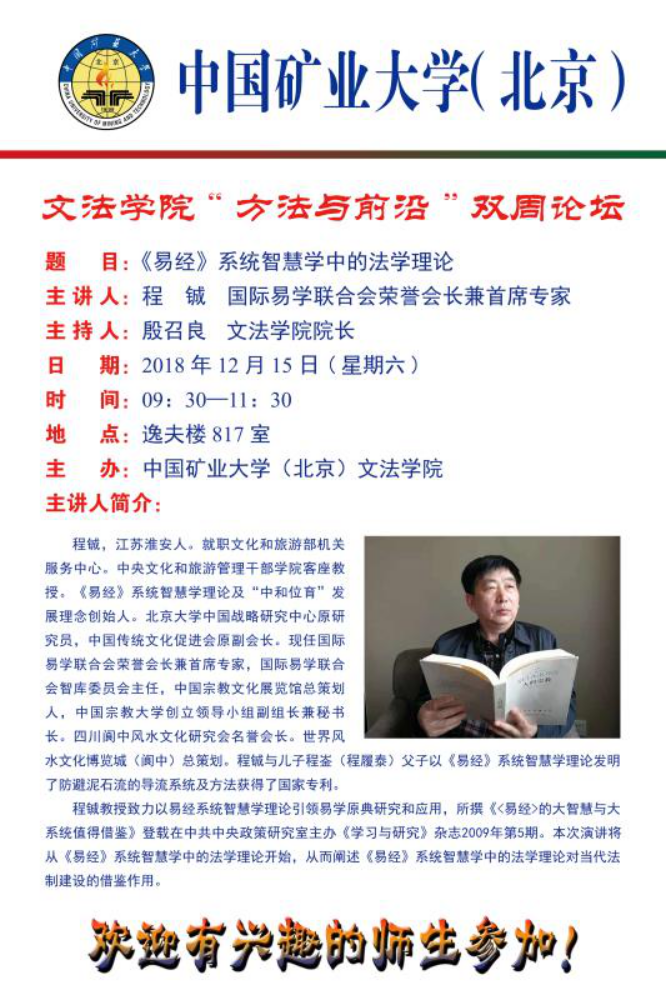 12月15日上午,国际易学联合会荣誉会长兼首席专家程铖教授在逸夫楼917教室发表“《易经》系统智慧学中的法学理论”的主题演讲,法学专业研究生和其他感兴趣的同学到场聆听,开云(中国)殷召良院长主持并点评。