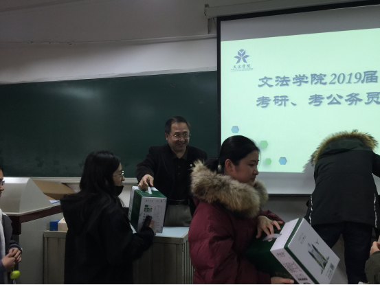 最后,董会泽给每位备考的同学送上营养品,衷心祝愿同学们能够考上心仪的学校和岗位,心想事成,旗开得胜。在座的同学们认真听取老师们的建议,并对学院的关怀表示感谢。