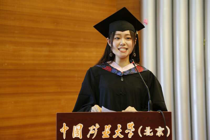 行政管理专业2014级韩旭同学作为本科毕业生代表发言。她感慨万千地回顾了大学四年生活。从拿着录取通知书的懵懂少女,到现在成熟自信的学生代表,矿大见证了属于她的蜕变。想再逛一次五道口宇宙中心,想再吃一顿胖阿姨的烤冷面,舍不得又爱又恨的导师老师,更舍不得情比金坚的同窗学友。她希望大家能够抓住这最后的时光,不留遗憾,青春无悔。最后,她真挚地祝福矿大继续独领风骚,老师们桃李天下,同学们前程似锦。