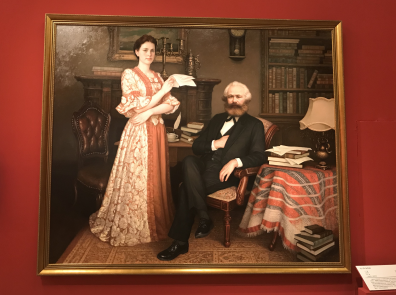 最后,大家参观了第三展厅—“新创作马克思主义题材的美术作品”,以此展示了马克思生平的经历,在进行理论创作和革命改造实践中的与人与事,以及展现马克思主义中国化的进程中,党中央高度重视马克思主义的研究和传播,展开了马克思主义学习和思想教育活动的作品——《窑洞中的灯光》、《延安时期学习马克思主义蔚然成风》等作品,使同志们深受鼓舞。