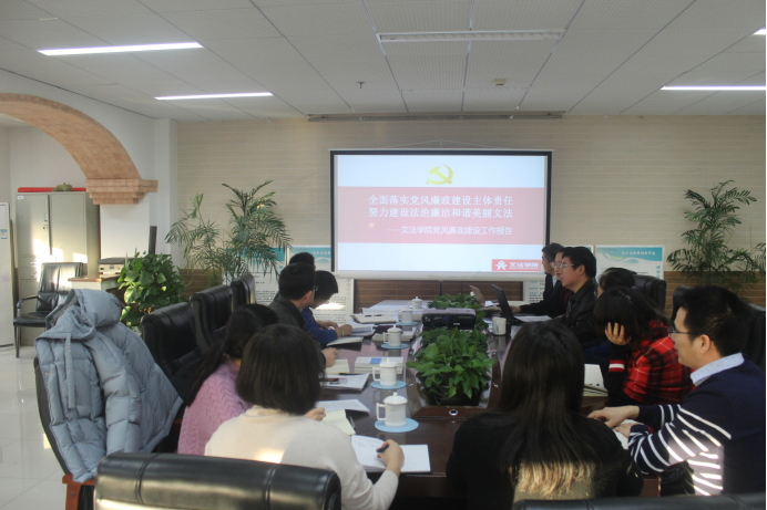 院党委书记董会泽作了题为《全面落实党风廉政建设主体责任努力建设法治廉洁和谐美丽文法》的汇报。他从落实党风廉政建设责任制、班子及成员遵守党的纪律和规矩情况、意识形态工作、廉洁教育特色工作、推进惩治和预防腐败体系建设、问题整改等六方面汇报了学院党风廉政建设工作。院长殷召良、副院长许卉艳从学院工作角度进行了补充。副院长、廉政研究中心执行主任刘金程汇报了廉政研究中心的工作。