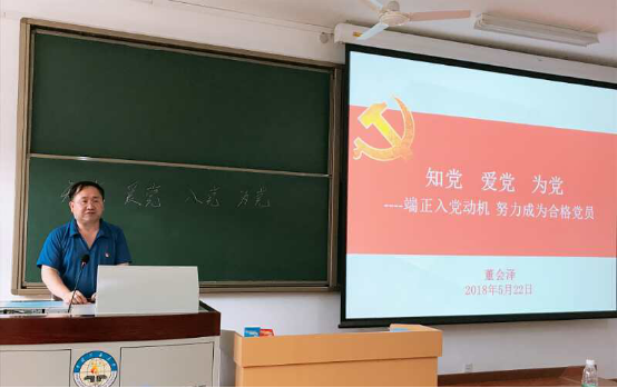 董会泽老师以生动形象朴实的语言为大家作了题为“知党、爱党、入党、为党——端正入党动机,努力成为合格党员”的专题报告。董书记指出:争取入党的首要问题就是端正动机,只有将实现共产主义,全心全意为人民服务作为精神动力,它才能正确引导和支配着我们的行为。如何端正入党动机是争取入党的基本途径。要实现的基本目标就是做合格党员,做合格党员就要用党员标准来严格要求自己,坚持按照党纲,党章的规定行动,正确把握十种关系,不忘初心,继续前行。